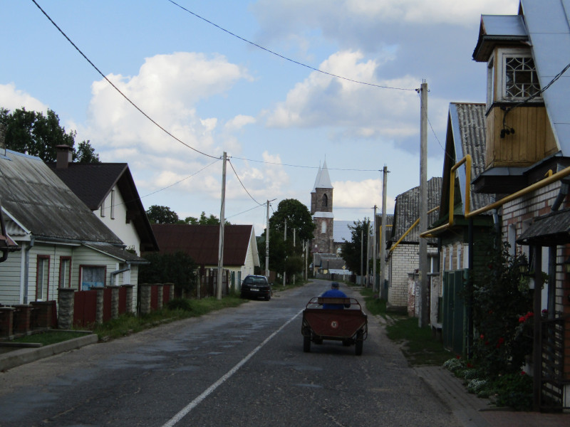 Ещё одно интересное место на бывшем советско-польском пограничье — Рубежевичи. Даже само название как бы намекает на пограничный статус, хотя к польско-советской границе оно, естественно, отношения не имеет. Рубежевичи находятся в Столбцовском районе, т.е. на бывшей польской территории, при этом совсем близко от бывшей границы. Подозреваю, что из СССР были хорошо видны башни основной достопримечательности Рубежевичей — костёла св. Иосифа. Рубежевичи имеют статус агрогородка, но по сути это — большое село: Здание почты. Историческое, конца 19 века: Подходим к костёлу. Похоже, на знаке кто-то специально переправил его название на более польский манер. Хотя никто в Рубежевичах на польском не говорит, слышна только русская речь, причем совершенно чистая: Парк камней перед костёлом. Открыт в 2006 г. Здесь размещены 46 камней с названиями деревень, которые относились к приходу костёла св. Иосифа. В лучшие времена приход был весьма внушительный — 7000 прихожан, из них 3000 — в самих Рубежевич