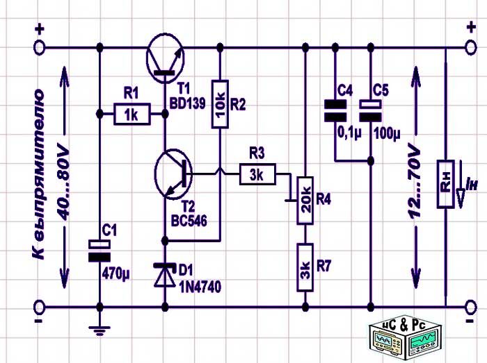 Схема состоит из двух основных транзисторов: BD139 (T1) и BC546 (T2), которые работают вместе для стабилизации напряжения. Давайте разберем назначение каждого элемента и его роль в работе стабилизатора: