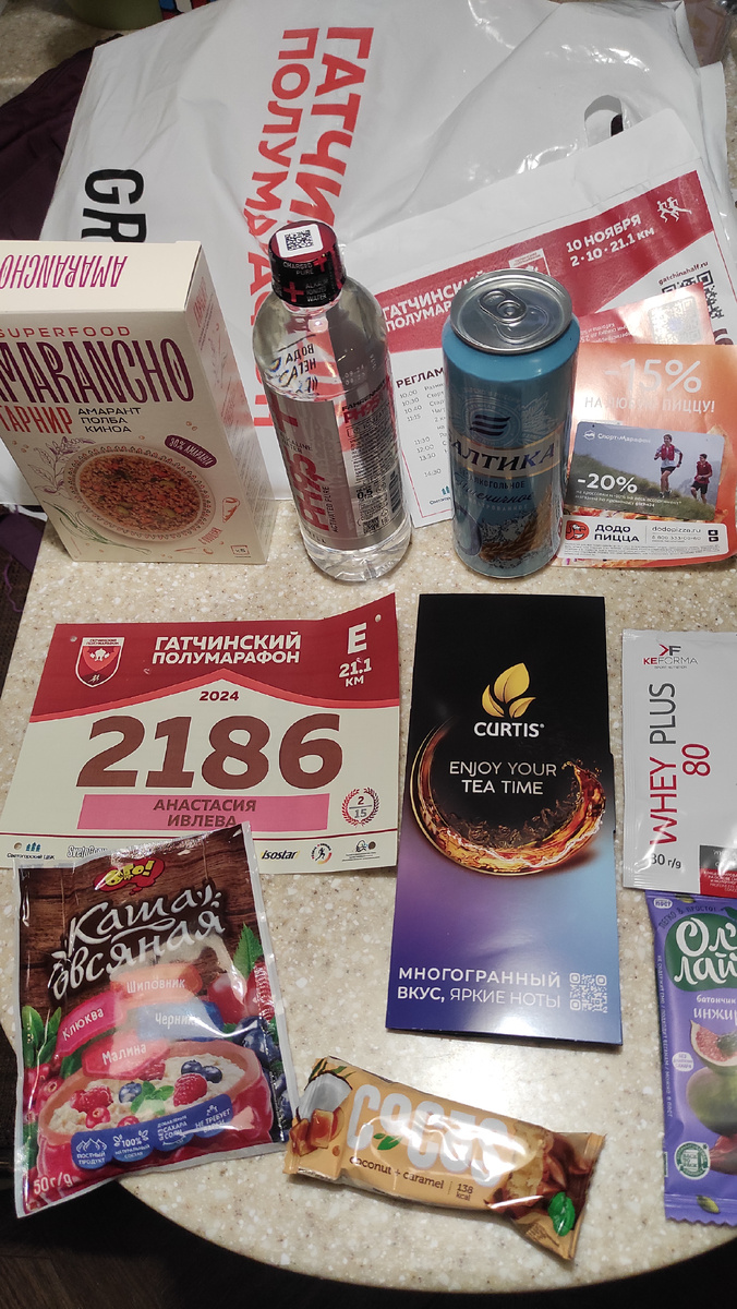 Сегодня я пробежала очередные "5верст" в своем родном парке, а уже завтра меня ждёт очередная половинка. Слот получен, с большим пакетом вкусняшек и полезностей, новые леггинсы и футболка с длинным рукавом куплены и жду Гатчинский забег, который я побегу шестой раз. Из этих забегов 21 километр я бежала лишь раз, остальные были по 10 километров. Для меня Гатчина имеет особое значение, первый массовый забег "десятки". Здесь я первый раз познала что такое "терпелка" и характер. Ветряная погода, промокшие ноги и невероятная поддержка на маршруте. В этот раз бегу 21 километр. Кстати на стартовом номере интересная пометка, сколько всего было стартов и какой по счету бежит спортсмен. У меня стоит цифра 2/15. Что ж погода должна быть ясной, но холодной +2 градуса. Поэтому скорее всего на лонгслив надену флиску. Бежать быстро мне совсем не хочется. Я вообще последнее время поняла, что быстрые старты - не мое. Но попробую, если пойдет, буду держаться назначенного тренером темпа. Если нет,