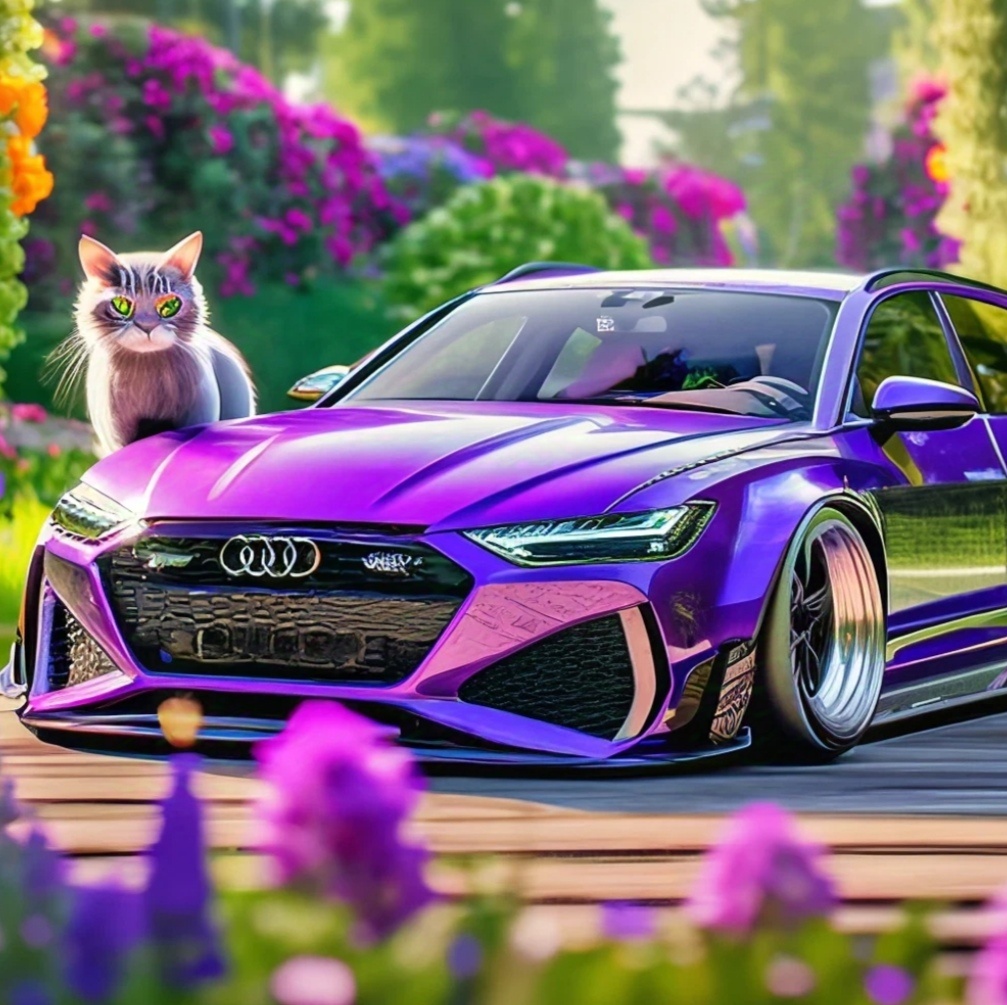 Audi rs6 2023 года, фиолетового цвета, в обвесе rocket bunny, stance, рядом ходит милый котик, в летнем саду, красочные цвета, в стиле сказки, необычное освещение, красивые цветы, кот ходит рядом с машиной, пушистый милый кот, 4к, высокая детализация, мягкое освещение, высокое разрешение, красиво, эстетично, профессиональное фото, реалистично, 4k, f/2.8, 1/250s, 30mm lens, ISO 100. Репортаж!