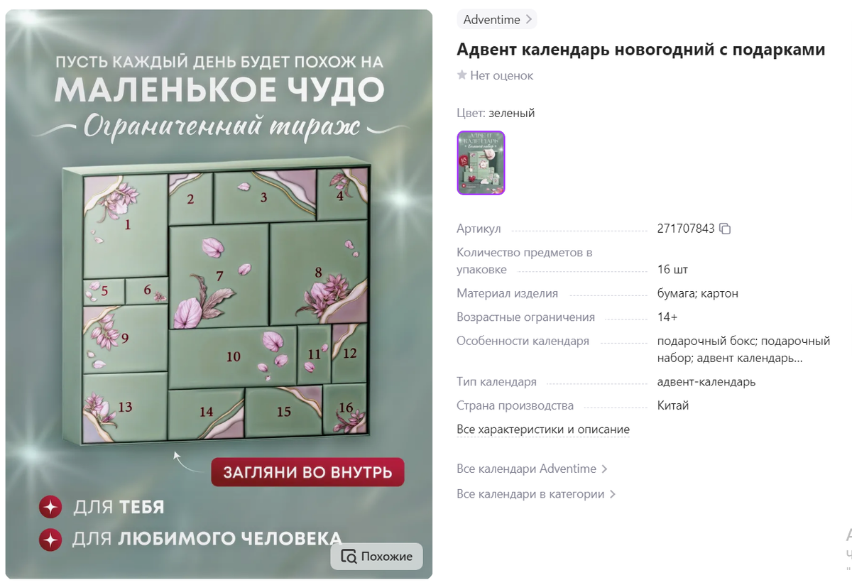 Я обожаю смотреть как блогеры распаковывают адвент-календари. Я каждый раз кайфую. У меня есть даже мечта накупить календарей и открывать их на видео. Мне кажется это очень крутое занятие. Сегодня я сделала подборку лучших адвент-календарей которые я нашла на WB. Что такое адвент-календарь? У вас есть коробка с закрытыми пронумерованными окошками. и каждый день вы открываете одно и смотрите что вам попалось. Также смотрите внимательно. Если хотите что бы был сюрприз, то сильно не листайте карточки товара у продавца. Потому что практически все в 3-5кадре показывают содержимое коробочки. А мы же хотим устроить себе сюрприз. А так же адвент-календарь может стать шикарным и неожиданным подарком. Артикул-271707843 Первый календарь на 16 ячеек. Тут календарь для девушек и девочек. Выглядит очень стильно. И наполнение мне понравилось. Но рассказывать я вам не буду. Если хотите, то можете посмотреть сами. Но я не хочу делать спойлер))) Артикул-72861881 Тут предоставлены 30 видов духов по 2мл