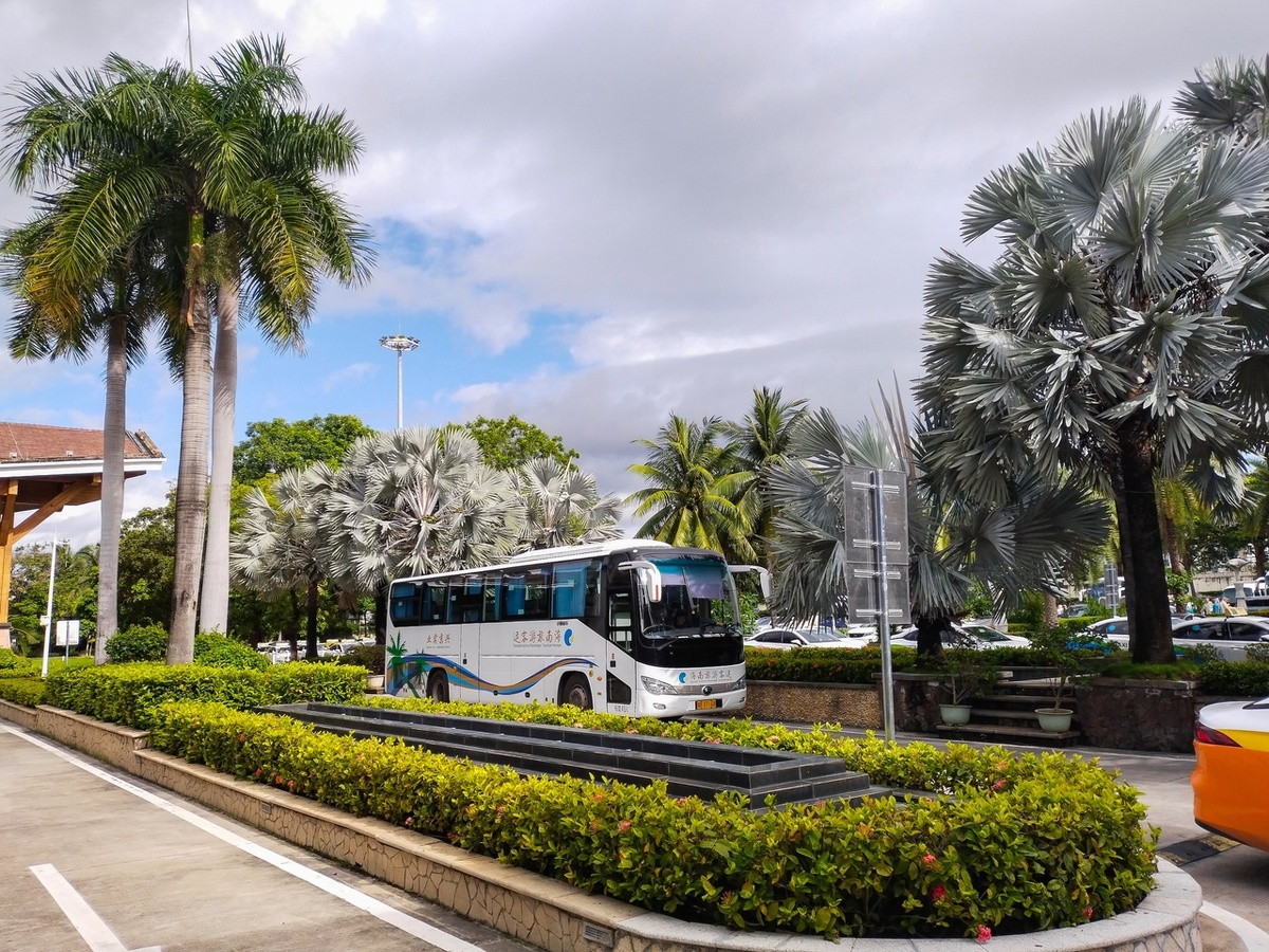 Территория у аэропорта очень ухоженная, частично зеленая и удивительно было чисто. У таксистов был свой сектор стоянки, а у автобусов свой. Автобусы уже привычные нашему глазу - Youtong. Вместе с нами прилетела еще группа туристов из Беларуси, поэтому на автобусной стоянке было очень оживленно. Наши автобусы найти получилось сразу - они от туристической фирмы Библио-Глобус (покупали тур у AnexTour). Здесь проверяют по списку наши фамилии, которые китайские товарищи внесли крайне криво. Выдают конверт ознакомительный - приглашение на инфо-встречу, погрузка багажа и ожидание отправления. В автобусе было хорошо, прохладно и была бесплатная питьевая вода в бутылках. Вот привкус был у нее очень странный, даже не знаю как описать, но хоть так. По первым ощущениям климат здесь - туши свечи. Влажность 100%, жарко, поэтому вода нужна. Подождать всех пассажиров именно нашего автобуса (в списке там было более 10 отелей), пришлось прилично, минут 40 точно. Пока все прошли проверки, пока пофоткались у пальм. Погода начала хмуриться, со стороны аэропорта надвигалась мощная такая туча. Как мне говорили знакомые и друзья - июль в Азии это сезон дождей, но из-за тропического климата дожди быстрые и особо не мешают. Что ж - посмотрим как будет.