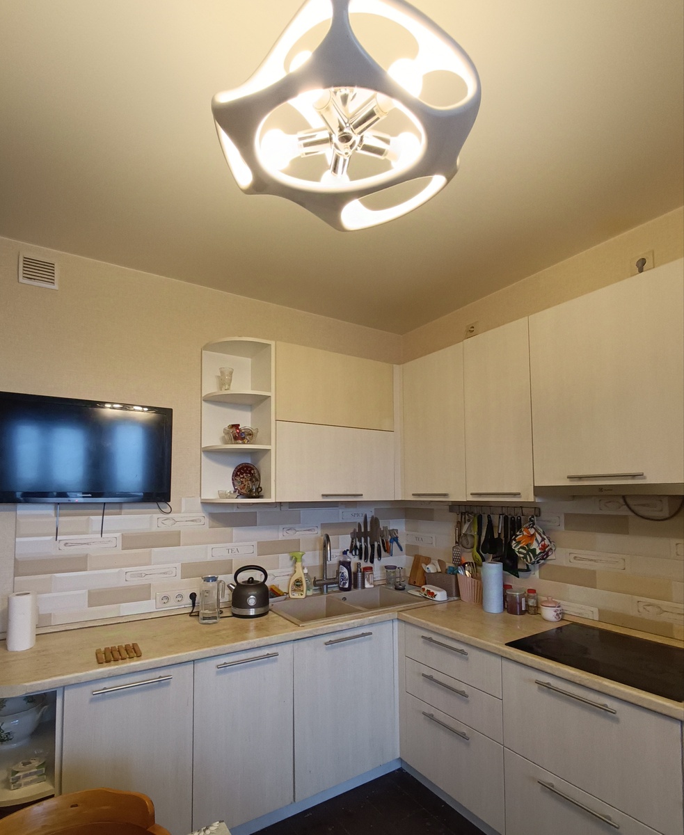 - В воскресенье с утра протёрла потолок и люстру. Потолок протираю специально обученной шваброй прямо с пола, без моющих средств, просто водой. Для того, чтобы помыть люстру, пришлось воспользоваться любимой стремянкой.