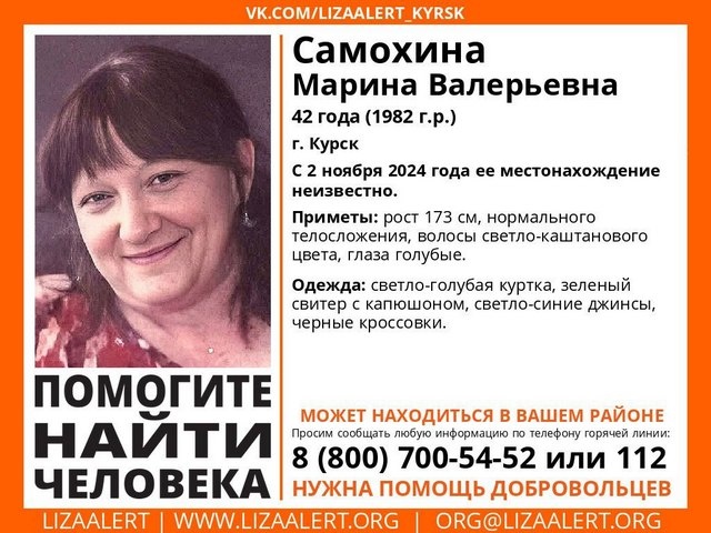 По данным волонтеров, пропала Самохина Марина Валерьевна. Местонахождении жительницы Курска неизвестно со 2 ноября.