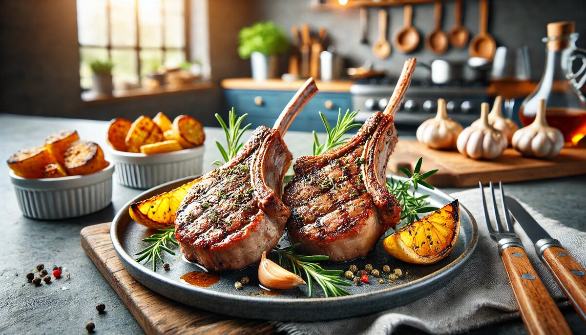 Жарьте по 5-6 минут с каждой стороны для средней прожарки (medium-rare), или 7-8 минут для более полной прожарки. Если отбивные толстые, можно добавить еще минуту-две с каждой стороны по необходимости. - Отдых:Достаньте отбивные с гриля и дайте им отдохнуть на разделочной доске 5 минут перед подачей. Это позволит сокам равномерно распределиться в мясе.