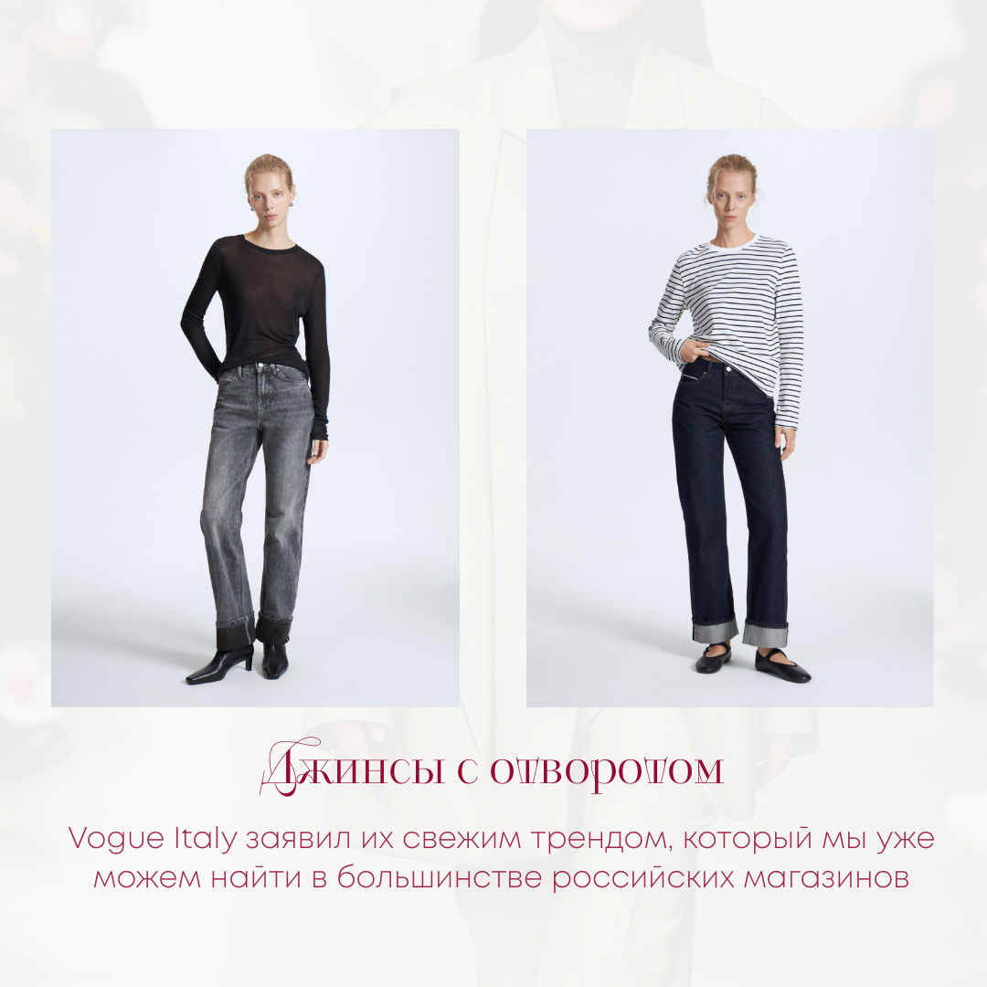 Джинсы - must-have в любом гардеробе. Разберемся, на какие джинсы обратить внимание, чтобы разнообразить привычные образы. А какие джинсы актуальны для базового гардероба. Анализ сделан исходя из тенденций сезона осень-зима 24/25. Джинсы с отворотами — это свежий тренд, который появился на подиумах и быстро прошел в магазины. Внимание: если ваш рост ниже среднего, отвороты могут "съесть" пару сантиметров, визуально сокращая ноги. Лучше всего такие джинсы смотрятся на высоких девушках (от 170 см), но если хотите попробовать, выбирайте аккуратные отвороты. Их можно найти в Lime, Maag, Zarina, Be Free и других брендах. Эти джинсы — настоящая находка для большинства фигур. Они подчеркивают бедра и ягодицы, при этом делают ноги стройными. Отлично смотрятся с обувью на низком каблуке или платформе, с квадратным или острым мысом — это придаст образу четкости. Буткаты могут быть как расклешенными от бедра, так и от колена — выбирайте, что вам нравится. Прямые джинсы — это классика, которая не