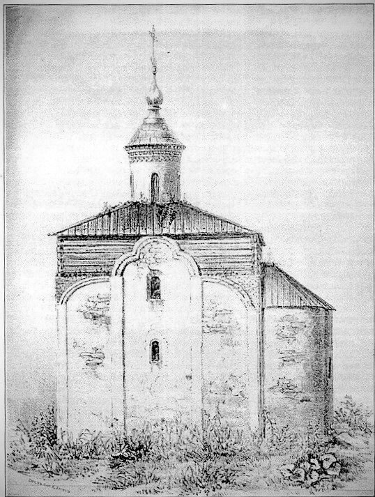 Перед разрушением храма в середине XIX в. его успели зарисовать Д. М. Струков и Н. А. Мартынов (рисунок Струкова опубликован в 1859 г., Мартынова – в 1915 г. В. К. Мясоедовым и П. Л. Гусевым). В. В. Стасов поместил в одной из своих работ продольный разрез храма и вид на южный рукав пространственного креста. На основании данных чертежей и рисунков можно реконструировать облик памятника: это был небольшой одноглавый одноапсидный храм с подцерковьем. Размеры храма – 8×8 м (без апсиды), подкупольный квадрат – 2×2 м, столбы в подцерковье и в храме имели квадратное сечение. С востока к храму примыкала невысокая широкая апсида. Храм имел деревянный притвор (упоминается в 1545 г.)