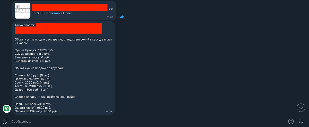 В современном бизнесе оперативное получение актуальной информации играет ключевую роль в принятии решений. Мы рады представить наше новое решение, которое позволяет автоматизировать процесс отправки отчетов из сервиса МойСклад в указанный Telegram-чат. Теперь вы сможете получать всю необходимую информацию о продажах, выручке и способах оплаты в удобном формате каждый день в одно и то же время. Ежедневные отчеты позволяют оперативно отслеживать ключевые показатели бизнеса, такие как объем продаж, выручка, популярные группы товаров и способы оплаты. Это помогает принимать обоснованные управленческие решения и своевременно реагировать на изменения в рыночной ситуации. Отчет, который будет отправляться в Telegram-чат, содержит следующую информацию: - Объем продаж за день. - Общая выручка. - Список проданных групп товаров. - Способы зачисления средств (наличный расчет, безналичный расчет, оплата по QR-коду). - Прикрепленный файл в формате PDF с детализированной информацией. Автоматическая о