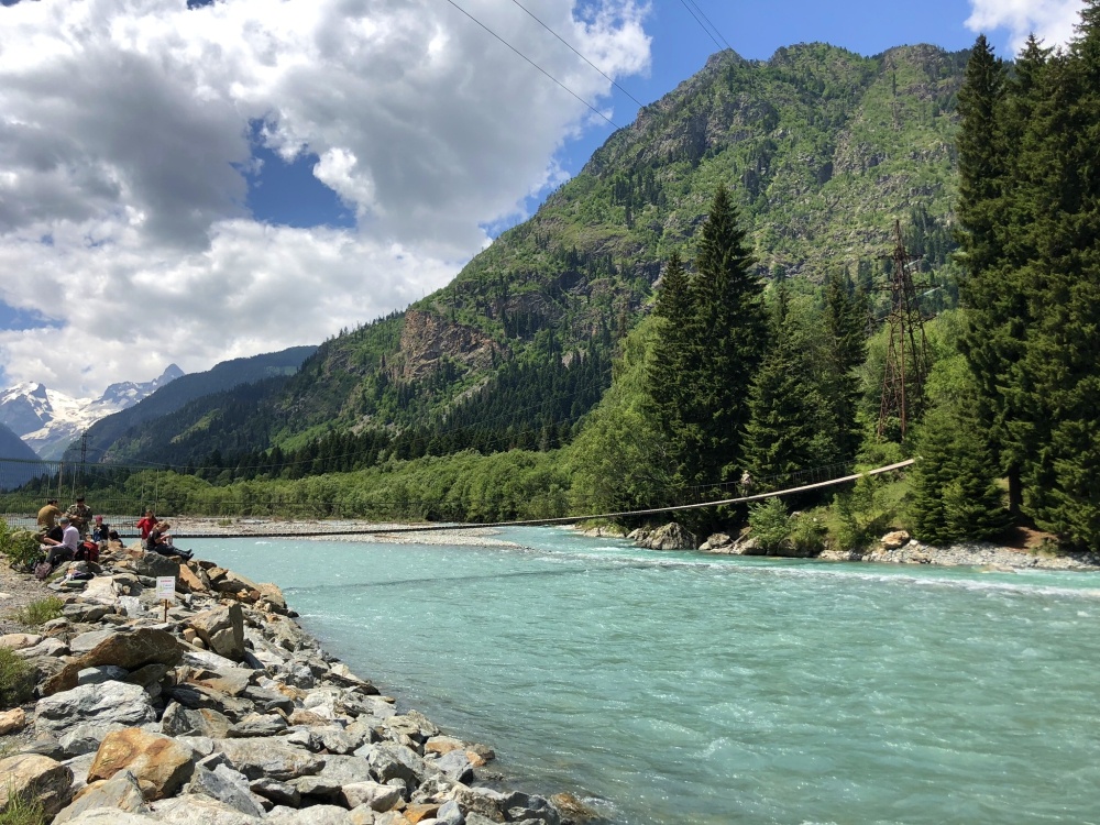Из автомобиля на берегу доносится «We Are the Champions» - хорошая настройка перед долгим походом на Бадукские. Подкрепившись земляникой, найденной у реки, направляемся к подвесному мосту над рекой Теберда. Вода под ногами молочно-бирюзового цвета, искрится и переливается на солнце, весело журчит и перекатывается через камни. Тропа на озёра идёт преимущественно через лес вдоль реки Бадук – притока Теберды, образующего все три водоёма. Перепад высот большой, нужно рассчитать силы, чтобы дойти до каждого из трёх, искупаться и вернуться обратно. Поначалу дорога резко поднимается вверх по лесной местности, и мы стараемся не зацепиться за массивные корни деревьев, которые местами образуют удобные естественные ступеньки. Вдыхая чистейший воздух хвойного леса, забываешь о всех невзгодах, оставшихся по ту сторону реки. Муж находит более-менее прямую ветку, очищает её и превращает в треккинговую палку. При таком крутом подъёме – это отличное решение. Наверху нас встречает горная река с такой же