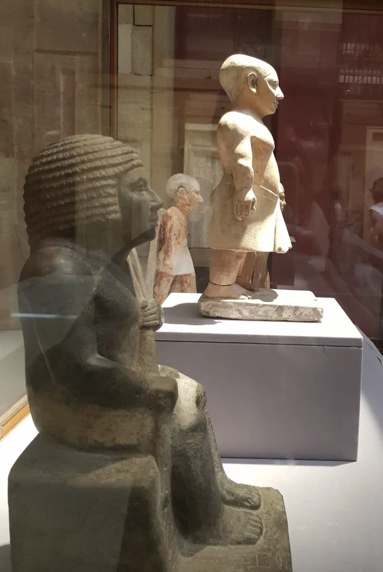 В Древнем Египте, как и в других культурах Африки, карликов очень любили. Карлики считались носителями магического начала. Карликов охотно брали в ювелиры и вообще во все те специальности, которые были связаны с трансформацией материала, созданием произведений искусства. А еще карлики были исполнителями священных танцев, увеселителями фараона, ведь великий бог Бэс, хранитель домашнего очага, защитник от порчи и сглаза тоже был карликом. При одном из великих царей эпохи пирамид Пепи II произошла интересная история, когда один из его вельмож, Хуфхор, отправился с экспедицией в далёкие страны Африки, на территорию нынешнего Судана. Он поверг там всяких троглодитов и другие племена, и привез оттуда много даров. Он написал для фараона письмо, где перечислил все дары, которые он везет с собой. Одним из чаров был карлик далёкого племени, который "весело пляшет и поет и это специальный подарок его величеству". Стоящая статуя Хнумхотепа Правила тогда великая царица Анхесенмерира