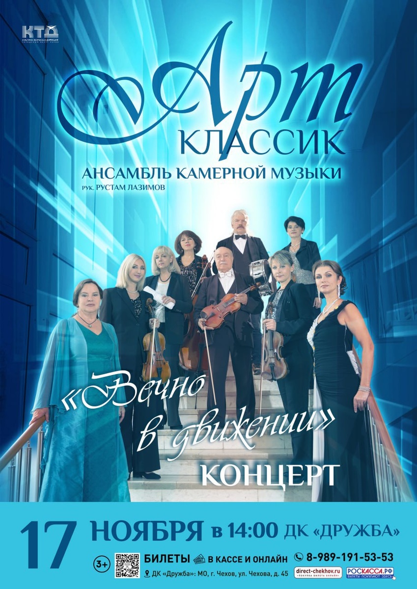 💥 Для истинных ценителей музыки! Приглашаем вас на захватывающий концерт ансамбля камерной музыки "Арт-классик" - "Вечно в движении". Музыканты приглашают Вас погрузиться в мир изысканных мелодий и ярких эмоций! Это не просто концерт — это путешествие в мир музыки, которое вдохновит и оставит незабываемые впечатления. В программе: • Известные произведения классических композиторов; • Современные музыкальные интерпретации; • номера с участием Елены Коротковой, Елизаветы Кравцовой, Елены Каменской. Не упустите возможность стать частью этого музыкального события! Мы ждём вас! 📶 Категория: Концерты 🚫 Возраст: 6+ 📆 17.11.2024 🕕 14:00 🏢 Культурно-творческая дирекция г.о. Чехов 📍 г. Чехов, ул. Чехова, д.45 💰 Цена от: 200 до 400 ₽ 🎫 Купить билет: https://чехов.роскасса.рф/event/1763794