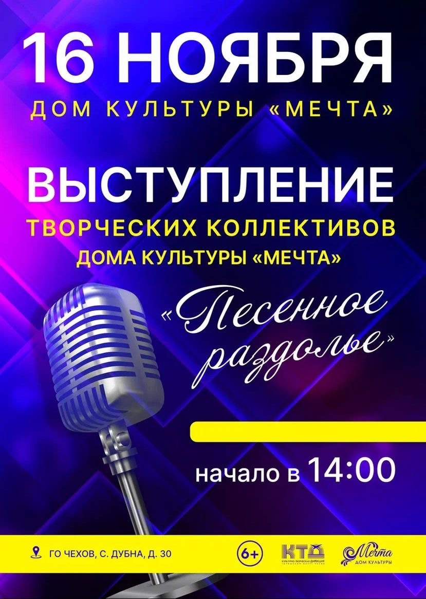 💥 Приглашаем на праздник музыки и творчества в г. о. Чехов 📢 Приходите всей семьей на концертную программу «Песенное раздолье»: 🎷 получите заряд музыкального вдохновения 🎻 погрузитесь в калейдоскоп талантов 🫶 наполнитесь положительными эмоциями 🎙️ Ждем Вас как обычно в нашем уютном зале 📶 Категория: Концерты 🚫 Возраст: 6+ 📆 16.11.2024 🕕 14:00 🏢 ДК «Мечта» 📍 г.о. Чехов, с. Дубна, д.30 🪙 Стоимость билетов - Бесплатно❗️ #ДКМечта #Дубна #КТД #ГоспабликиМО #ГородскойОкругЧехов #АктивноеДолголетие