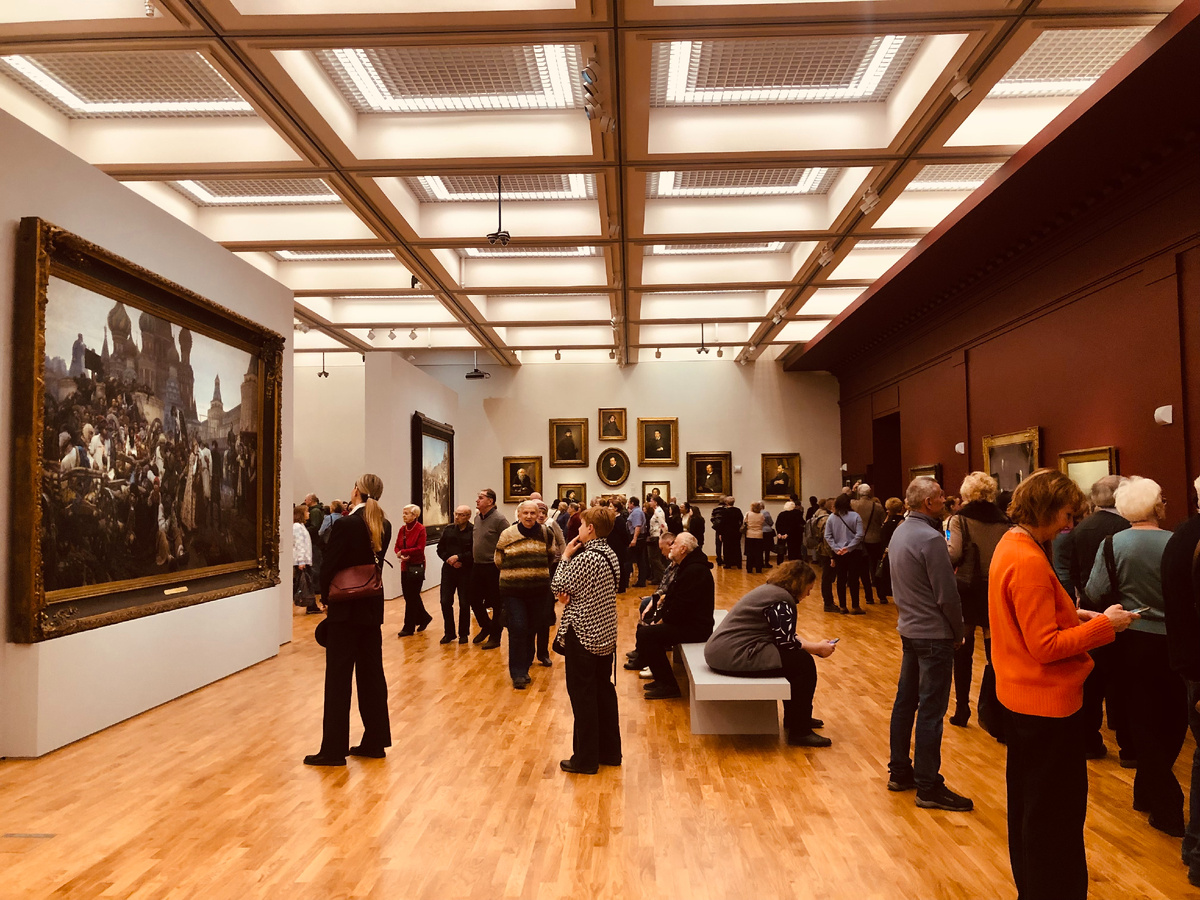 Основная часть картин, представленных здесь, – это картины, которые участвовали в передвижных выставках и были специально для них написаны, путешествовали по российской провинции.
