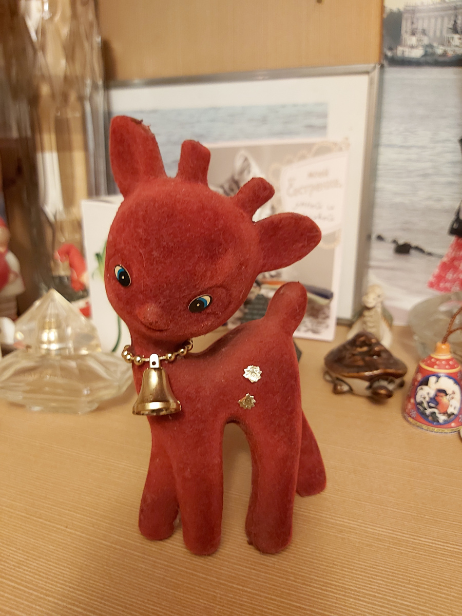 Этот раскосый олененок с верхнего фото - игрушка моей племянницы. Пластмассовый каркас с каким-то бархатным напылением. Он из тех игрушек, которые удостаивались чести размещения в серванте. Помните эти стеклянные витрины с посудой? Иногда туда ставили какую-нибудь фотографию или игрушку. И все! Как в сейф! Сохранность была обеспечена. Вот олененок из таких "везунчиков". Сервантного хранения. Поэтому и колокольчик цел и напыление.