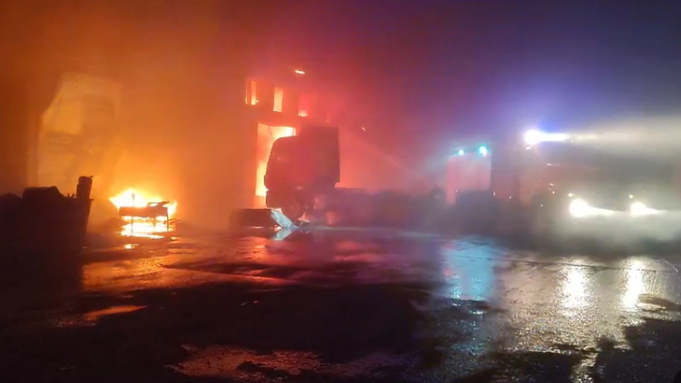 Пожарный поезд помогает тушить крупное возгорание в Барнауле в гаражных боксах