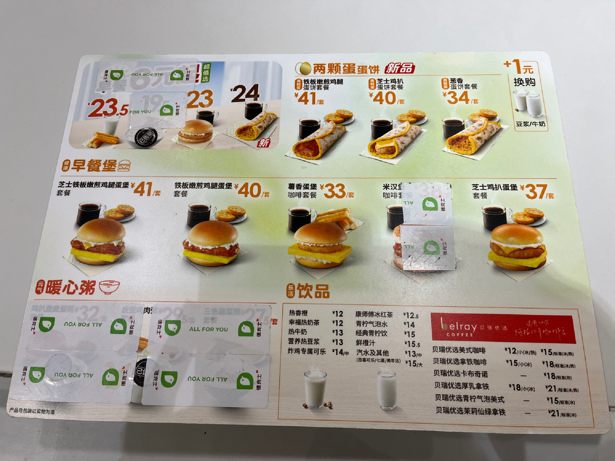 Завтрак в местном фастфуде 37 юаней: бургер, кофе, хашбраун.