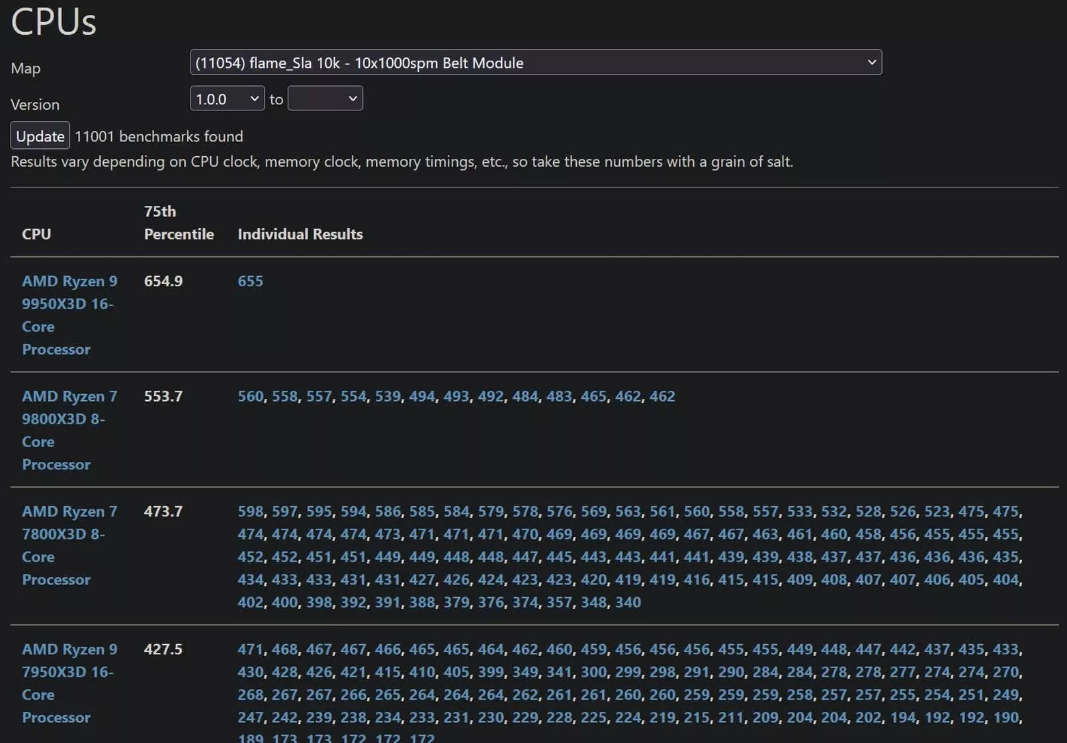 Бенчмарк Factorio размещен на сайте Factoriobox, где перечислены результаты тестирования Ryzen 9 9950X3D, что является первым случаем, когда процессор был замечен в сети. В тесте Ryzen 9 9950X3D набрал 654,9 UPS, что намного выше оценок Ryzen 7 9800X3D и Ryzen 9 7950X3D. В то время как первый набрал в среднем 553,7 UPS, последний показал средний балл 427,5 UPS.