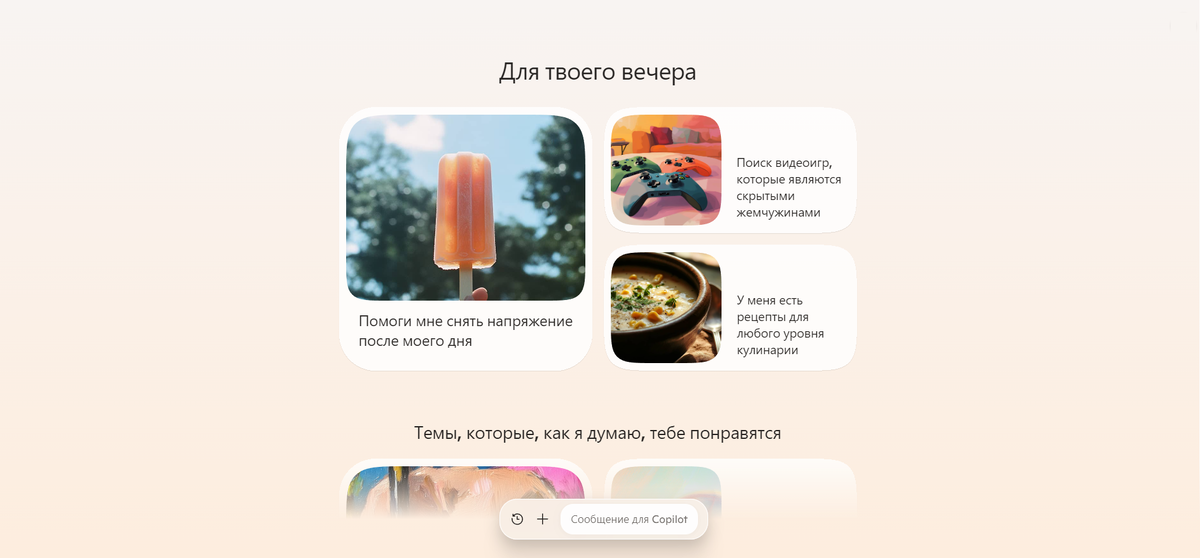 3) Функция "Познание" ("Copilot Discover") отображает рекомендации полезных функций умного помощника "Копилота", а также предлагает темы для общения с умным помощником "Копилотом". Данная функция работает и настраивается на основании собираемых Майкрософт данных об использовании других приложений и сервисов Майкрософт, и в будущем будет добавлена возможность настройки и использования данной функции на основании истории отправленных запросов, и полученных ответов.