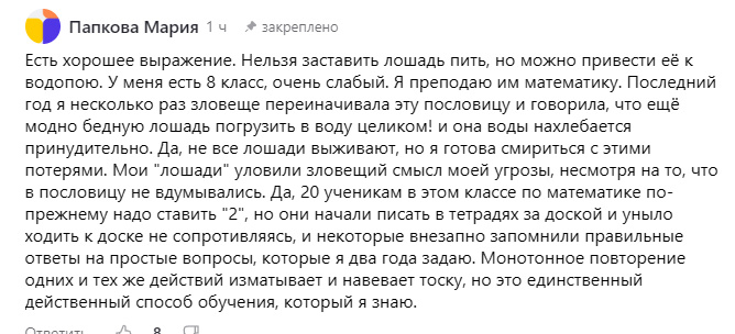 Была давно уже написана вот такая статья. Когда её публиковать, я не знаю. Опубликую сегодня. --- Есть выражение, которым часто можно объяснить свою несостоятельность педагогическую и какую-то ещё тоже. "Можно привести лошадь к водопою, но нельзя заставить ее пить ..." Нейросеть про это пишет вот так: You can lead a horse to water, but you can’t make him drink — «силой не всё возьмёшь». Дословно — можно привести лошадь к водопою, но не заставить её пить. Значение: можно помочь человеку, предоставить ему шанс, но нельзя заставить его сделать что-то силой. Это одна из самых древних английских поговорок, которая до сих пор активно используется в повседневной речи. И вот, мне кажется, здесь ближе смысл. Нельзя силой заставить пить. Это так. А вот чем можно? Правильно, можно хитростью. Я давно думала над этим выражением относительно Гриши и обучения сложного ребёнка. Потому что всё оно строится на том, что глотать он не будет вообще, к скольким ты водоёмам его не подводи. Но я же знаю,