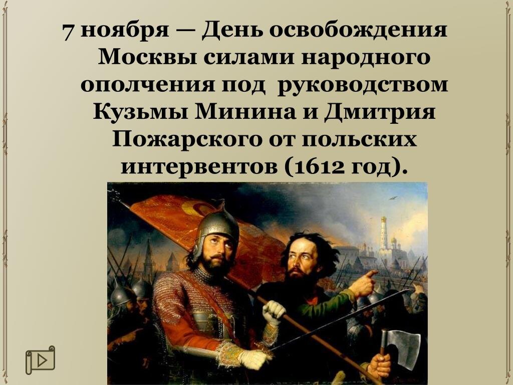 7 ноября 1612 года (по новому стилю) ополчение Минина и Пожарского взяло Кремль. День в день с ВОСР (так сейчас именуют Октябрьскую революцию.) А 4 ноября ополчение всего лишь преодолело укрепления Китай-города. Но именно 4 ноября сделали Днем народного единства – потому что совпадает с церковным праздником. А по правильному, подлинный праздник – 7 ноября. Освободили Москву от интервентов. Тогда и надо праздновать.