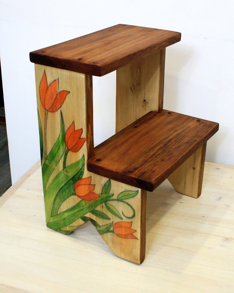 Очень люблю тепло и даже чтобы совсем жарко было. Поэтому полок в парной упросила мужа сделать повыше, но вот как туда залезть? Стала думать, искать идею... Попалось в интернете фото какой-то старенькой лавочки. Маленько под свои возможности адаптировала и взялась пилить-колотить... Сборка При строительстве дома от опалубки фундамента сберегла доски. Долго лежали, наконец пригодились! Сухонькие, легкие стали! Для лучшей склейки деталей использую деревянные шканты. Но тут главное ровно насверлить отверстий. По хорошему нужен кондуктор, но никак не куплю. Сверлю сама по карандашной разметке. Даже стало удаваться сделать это ровно ) На следующий день хорошенько отшлифовала и болгаркой, и шлиф машинкой, и руками. Доски были лохматые, пришлось приложить усилия. Зато вышли гладенькие! Рисунок Покрыла получившиеся боковины разведенной водной морилкой. Хотелось пригасить яркость древесины. Опять ворс поднялся, слегка прошлась наждачкой уже вручную. Далее нашла подходящую картинку, адаптировала