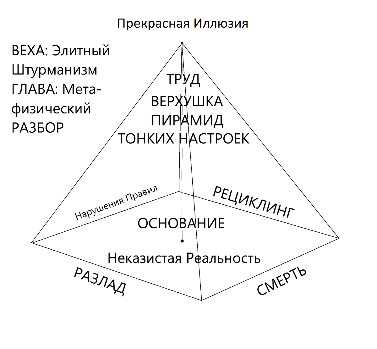 Веха: Элитный Штурманизм Глава: Метафизический РАЗБОР. Тезисы: 1. Тонкие Настройки доминируют над разладом (дисбаланс) и смертью (засыхание), так как всё живое стремится к накоплению сложности (а равно, материального смысла – Чем сложнее, Тем лучше). Любая вещественная атрибутика подтверждает главенство материализма. 2. Труд является ключевыми аспектами любой работы. Тщательно выверенная, но вместе с тем, индустриальная работа превращает труд – в адскую пытку. Между тем, жизнь без труда невозможна. 3. Верхушка пирамид тонких настроек означает то, что сложное, точное, аккуратное, и сбалансированное положение вещей достигается крайне трудно. Вместе с тем, люди не способны отказаться от подобных стремлений, так как они являются живыми. 4. Основание состоит из Неказистой Реальности, – а оно в свою очередь состоит из разлада (дисбаланс, конфликт ценностей различных концепций), смерти (функциональное разрушение, затухание), неизбежных нарушений правил (накопление опыта на пути следования к п
