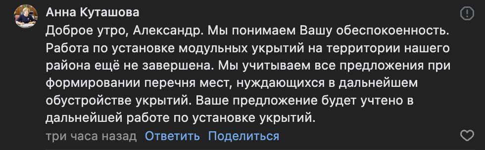 Увидела комментарий Куташовой и немного офигела...Сколько еще лет нам ждать укрытия?! Идет уже третий год постоянных обстрелов, а обещанная установка укрытий все никак не завершена! Сколько еще времени нужно, чтобы сделать то, что должно быть сделано еще давно? Почему простые жители остаются без защиты, когда опасность каждодневно угрожает нашему району? Понимаю, у вас там свои "мутки" — деньги нужно разложить по карманам, "порешать" с родственниками и знакомыми, провести пару тендеров для "нужных" людей. Время идет, отчеты делаются, бюджеты осваиваются, а укрытия, необходимые для безопасности людей, все еще остаются на стадии "работа не завершена". Когда, наконец, дело дойдет до настоящих действий?