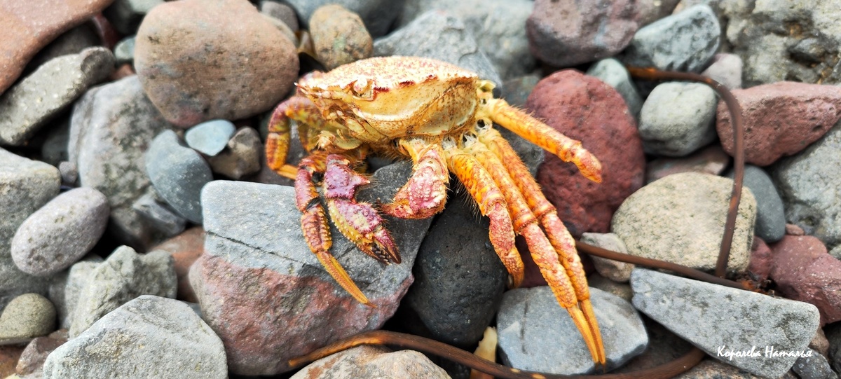 На скалах много пернатых обитателей, а под ногами остатки их пропитания. Огромное количество клешней, а то и полностью сохранившихся скелетов камчатских крабов (небольших) можно встретить тут на каждом шагу. Еще тут много морской капусты (говорят, что туристы из Китая пакуют ее в пакетики), но встречаются и предметы человеческой деятельности, например, старые шины.