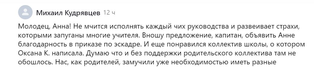 Сегодня разбираем комментарий постоянного читателя Михаила Кудрявцева. Михаил всегда даёт алгоритм действий для учителя, что делать, если не согласен с администрацией школы. Как действовать в рамках закона, и что можно предпринять. Отрадно, что Михаил сам работает в вузе и видит другую сторону школьной системы. Какие приходят выпускники. Как относятся к учёбе. Как ведут себя родители. Что могут сделать педагоги и родители, если они с чем-то не согласны. И всегда приводит примеры из своей жизни. Если мы конечно, "не твари дрожащие, и право имеем" по известному классику. Михаил предложил объявлять БЛАГОДАРНОСТЬ по нашему экипажу Алых парусов таким смелым учителям. Итак, предложение принимается на УРА)) И вот цитата из того поста, где Анна написала про отношения с администрацией школы. Вы можете прочитать, если не успели- И дальше Михаил рассказывает про примеры . Что делают родители и учителя в школе, где учатся его дети. Как они стараются бороться и менять то, с чем не согласны. Расс