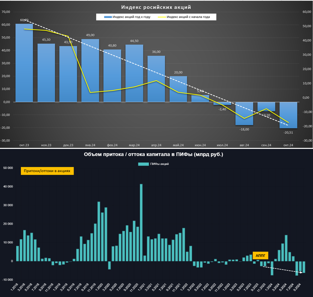 Финансовый рынок (ценные бумаги, фьючерсы, валюта и т.д.) быстрее всего реагирует на изменения в экономике, а значит позволяют обнаружить сильные тренды раньше отчетов на бумаге. Поэтому часто финансовый рынок называют быстрым индикатором, который дает дополнительное преимущество в анализе и оценке ситуации. Простыми словами, куда идут деньги, там формируется тренд и наоборот. Ниже выводы по движению денег в октябре 2024 года. Рынок акций ускорил темпы падение к предыдущему году: -20,5% октябрь vs +60,7 октябрь 2023 г. Чистые оттоки из фондов акций это подтверждают -6,2 млрд.руб. октябрь 2024 vs -2,6 млрд.руб. октябрь 2023 г. В фонды облигаций уже третий месяц подряд идут чистые притоки свежих денег, объёмы рекордные за последние 6 лет. Интересно, что пока индекс ОФЗ (RGBI) при этом продолжает падать: -17,86% октябрь 2024 vs -6,5% октябрь 2023 г.. Картинка интересная. Возможно, кто то, что то знает😊 В фондах ликвидности просто взрывной приток денег, в два раза больше сентября и в 3,5