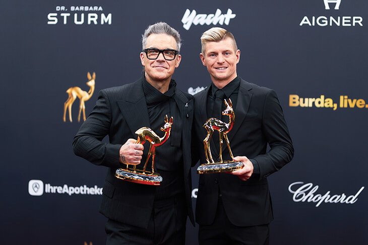 Да, в честь того самого олененка. Тони Кроос стал лауреатом немецкой телевизионной и журналистской премии «Бэмби» в категории «Спорт». Наградили за выдающуюся карьеру и личные достижения. Приз Кроосу вручил не менее звездный Робби Уильямс. «В коллекции Крооса 34 трофея. Это больше, чем у всей нашей сборной!» Уильямс подколол Англию Британский певец прочел красивую речь, прежде чем вручить Тони награду: «Я рад отдать должное величию своего дорогого друга и живой легенды. Тони Кроос – один из самых титулованных футболистов всех времен и один из важнейших полузащитников в истории. У него сильная нога и доброе сердце. Мы с Тони познакомились много лет назад, я его большой поклонник, и, похоже, я ему тоже нравлюсь. Тони, я всегда восхищался твоей игрой, твоим спокойствием с мячом и без него, твоим интеллектом, твоим пониманием игры и твоей инстинктивной сверхчеловеческой передачей. В коллекции Тони 34 награды, а это больше, чем у всей сборной Англии! Он выиграл главный трофей – чемпионат ми