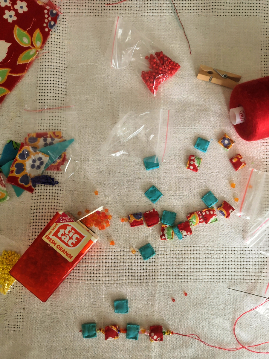 Сложила из них квадратики, подшила и получила тканевые бусины. И начала их соединять на нитку, между ними бисер и бусинки. Скоро будет видео на канале, как я их делала более подробно.
