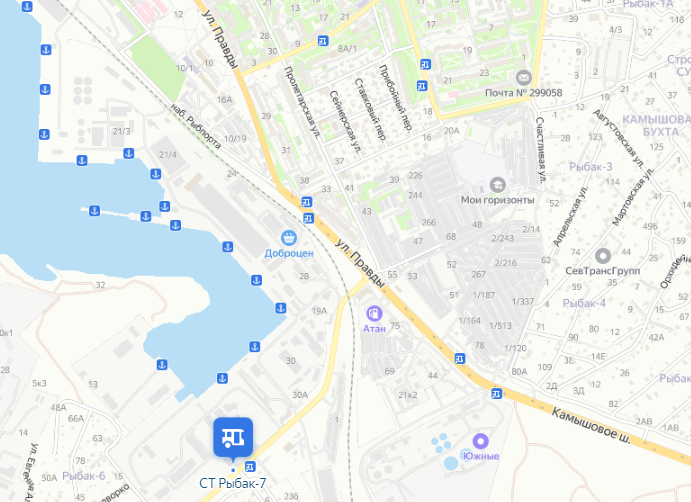 Здесь отметила остановку на которой нужно выходить. Можно увидеть улицу Правды, Камышовое шоссе, очистные ( "Южные"). На карте видно бухту - это Камышовая бухта и здесь располагается порт.