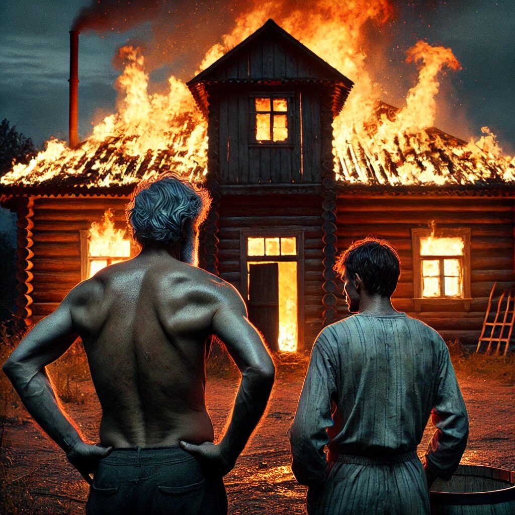 Собрались мы, как могли, за ведра схватились, а вода-то вся — в проруби у речки, а не в бане. Побежали, сапоги, как тяжёлые гири, сугробами снует. Глазами друг другу передаём — тону, мол, на помощь! Дёрнулись было обратно, в ведрах плеск воды и весь страх в глазах. Да только поздно уже, слышу, пыхнуло, как из кузнечного горна — сухое дерево, поленина, да жару задали. И все наши попытки — ведро сюда, ведро туда — как капля на сковороде: шипит и пропадает.