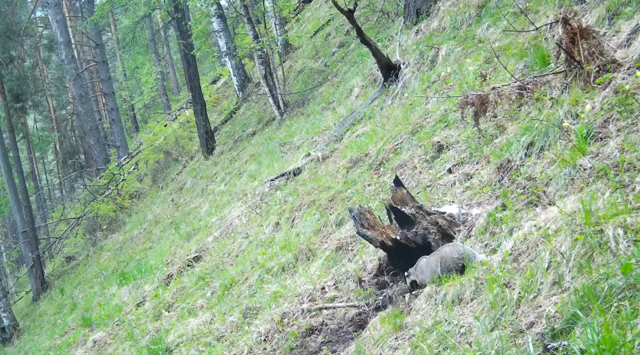 На кадрах фотоловушки барсук несколько раз подходит к солонцу и исследует следы других животных. После этого он перевернул носом брикет с солью и лизнул его. Потом барсук осмотрелся вокруг и направился трусцой вверх по склону.