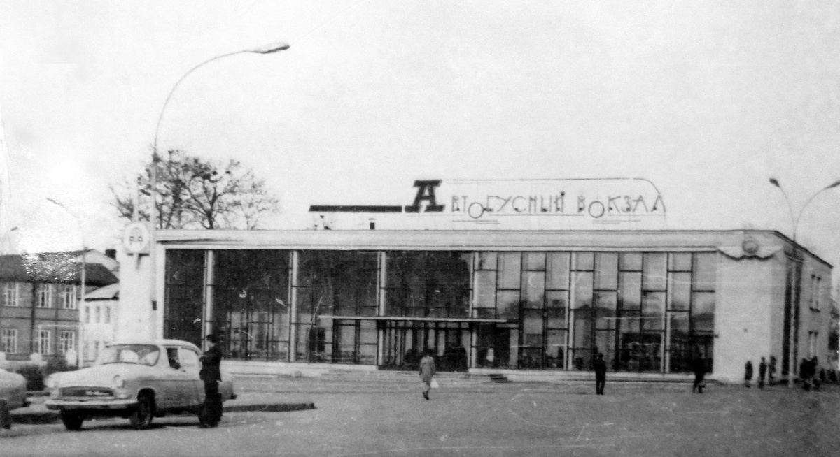 На снимке начала 1970-х здание автовокзала в своём изначальном виде. Сейчас, уже немного перестроенное и лишившееся вывесок, оно всё же сохранило свою главную достопримечательность - панно в зале ожидания. Фрагмент этой работы художников Валерия Смирнова, Александра Смирнова и Бронислава Шабаева можно видеть на второй карточке.