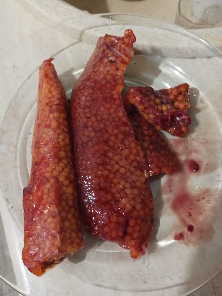 Извините, нет фото пленки на венчике, руки мокрые. Пленки получается большой лохматый лоскут с запутавшимися икринками( где- то чайная ложка точно).