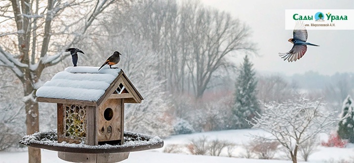 Зима — суровое время для птиц. В морозные дни они особенно уязвимы: привычные источники пищи исчезают, найти укрытие от холода становится сложнее. Нам, в питомнике «Сады Урала», хорошо известно, как важна помощь в холодный сезон, когда птицам особенно нужны корм и защита. Поддержка пернатых не только помогает им выжить, но и оживляет ваш сад, добавляя ему неповторимое зимнее очарование. Мы собрали полезные советы, которые помогут вам организовать правильную поддержку птиц зимой и сделать ваш сад комфортным и безопасным для них местом. Почему важно подкармливать птиц зимой? Зимой птицам нужно больше энергии, чтобы поддерживать тепло. Большая часть их ресурсов уходит на согревание, поэтому без высококалорийного корма птицам просто не выжить. Если в вашем саду будут кормушки, полные правильного корма, вы не только поможете зимующим птицам, но и привлечете их к себе на весь сезон, наслаждаясь оживленной и «певучей» атмосферой. Как помочь птицам зимой? Для защиты птиц и создания подходящей