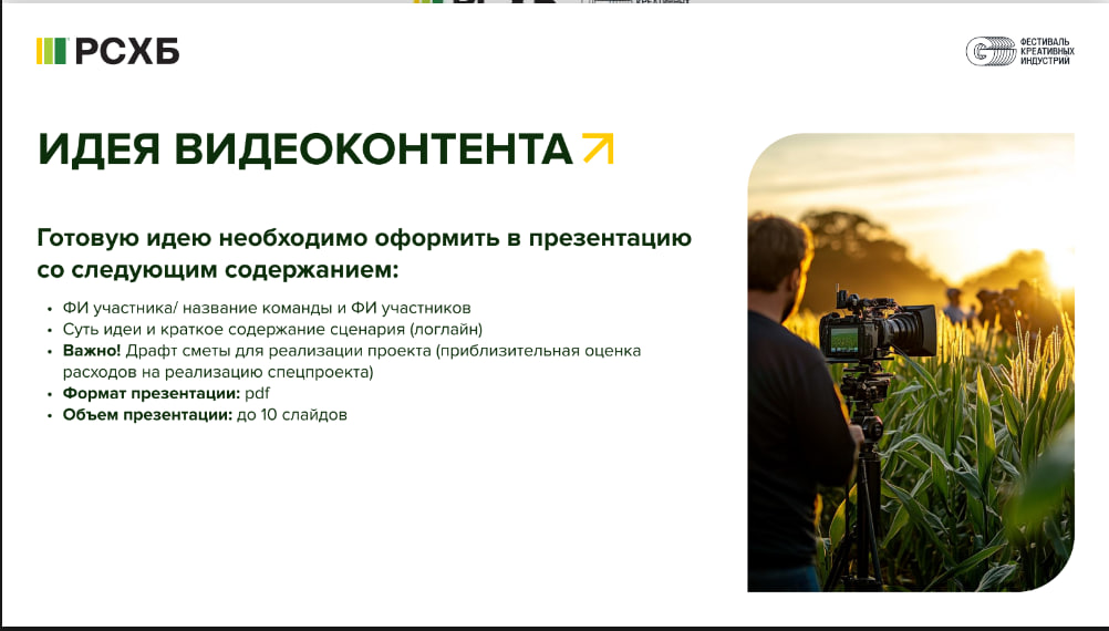 Создай креатив, который изменит будущее. Присоединяйся к конкурсу (https://rshb.g8.art/#close) от Россельхозбанка и Фестиваля креативных индустрий G8, в котором креаторы разрабатывают инновационные идеи, направленные на изменение образа сельского хозяйства. Три номинации: спецпроекты, наружная реклама и видеоконтент. Выбирай свою категорию и покажи, на что ты способен! Одна из номинаций - Идея видеоконтента. Готовую идею необходимо оформить в презентацию. В каждой категории 3 призовых места. Специальный приз — возможность реализовать идею совместно с Россельхозбанком для 1-го места в каждой категории. Все призовые места будут награждены дипломами и специальными наградами G8, а также призами от Россельхозбанка: головками сыра, ящиками вина, живой козой, ульями и ящиками клубники.