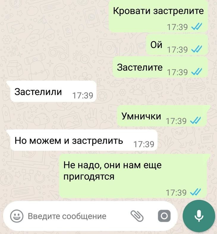 Ну что продолжим серию поднимающих настроение фотографий? Сегодня собрала для вас несколько забавных переписок, которые гарантированно сделают ваш день. И вы будете улыбаться, даже если за окном непогода, дела из рук вон плохо, и вообще всё как-то не очень удачно складывается в жизни. Согласитесь, что при чтении этой переписки вы улыбнулись? Понятно что, скорее всего, этот текст отправила мама своим детям, которые остались дома, пока она на работе. Но лично мне сразу представляется Дикий Запад, 18 век. Собираясь в бар, отец достаёт пистолет, даёт его детям и говорит: "А ну-ка, давайте - застрелите кровать. Она накосячила...." Ну что тут сказать? Эпичная и невероятно пугающая опечатка. А что если у них в отделе принято жрать всех, кто где-то накосячил или что-то сказал не так? И вдруг, после того, как он дожрёт руководителя этого направления, он решит сожрать и рекламодателей? Ну а что, почему бы и нет? Отличное решение. Летние фотографии и правда намного симпатичнее, чем осеннте или