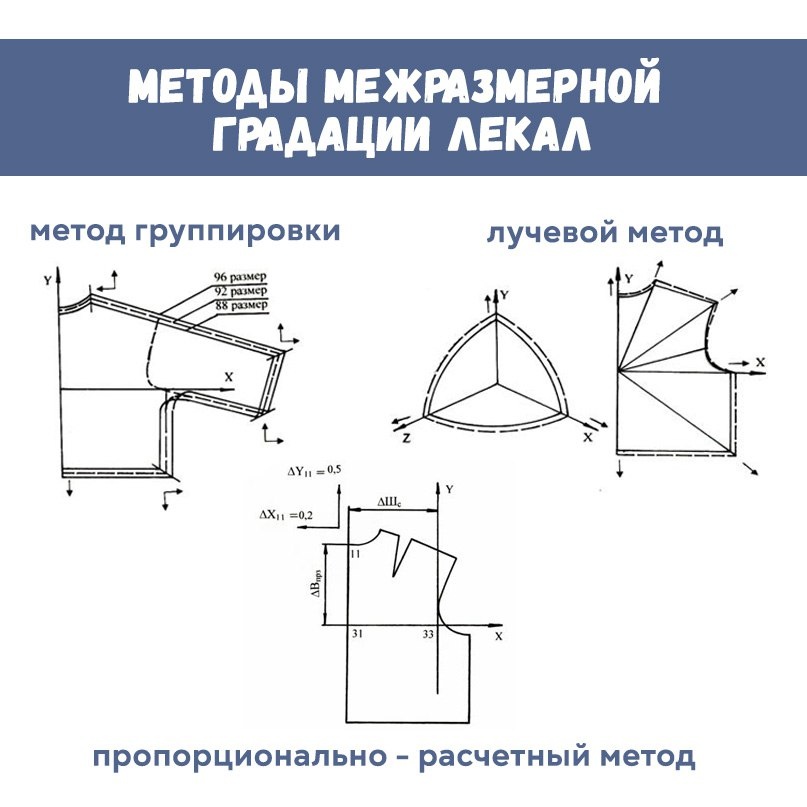 👗Градация размеров одежды – размножение по ростам и размерам Градация лекал – процесс построения группы лекал подобной формы и конструктивно-декоративного решения для заданного диапазона размеров, ростов или полнот за счет перемещения конструктивных точек лекал исходного (базового) размеро-роста. То есть если у нас размерный ряд из 40, 42, 44, 46, 48 размеров, то один мы берем за базовый (на который будет проводиться примерка), а остальные оставляем на градацию Получается один базовый + 4 на градацию (если один рост) 👉 При градации могут градироваться как размеры, так и роста. Размеры градируются в ширину. Роста - в длину, говоря простым языком 📌Существует три основных метода межразмерной градации лекал: ✔️ метод группировки - предусматривает совмещение по двум взаимно-перпендикулярным осям двух комплектов лекал (среднего и смежного с ним или среднего и крайнего размеров). ✔️ лучевой метод – из определенной точки (фокуса) через основные конструктивные точки детали проводят прямые л