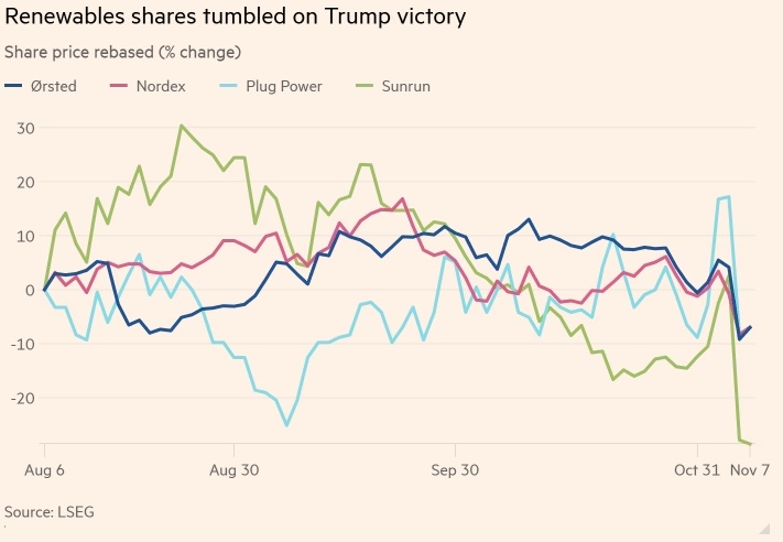 Акции компаний, занимающихся возобновляемой энергетикой, упали после победы Трампа. Пересчет цены акций (% изменения). Источник: LSEG