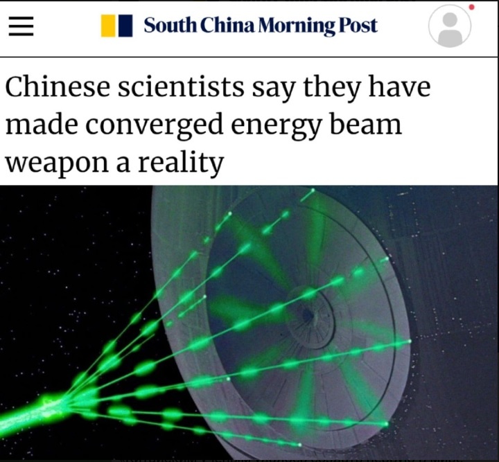 КНР заявили, что успешно испытали свою «Звезду смерти», собирающую микроволновые лучи в один мощный луч, способный уничтожить вражеские спутники. «Китайским ученым удалось создать первую в мире систему синхронизации для конвергентного сложения микроволнового излучения от нескольких источников в один мощный энергетический луч. Напоминающую «Звезду смерти» установку из восьми платформ, обладающих своим источником излучения, настроили на формирование одного луча, мощности которого хватит для подавления сигнала GPS на орбите. Таким же образом можно передавать на Землю добытую в космосе энергию».