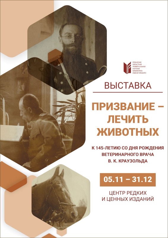 5 ноября в читальном зале центра редких и ценных изданий начала работу книжно-документальная выставка, приуроченная к 145-летию со дня рождения Всеволода Константиновича Краузольда (1879–1970) – ветеринарного врача, выходца из потомственных дворян Ярославской губернии, чья жизнь и трудовая деятельность тесно связаны с Рязанским краем. Выпускник Казанского ветеринарного института, в 1907 году В. К. Краузольд поступил на службу в 35-ю артиллерийскую бригаду, дислоцированную в Рязани, где осуществлял надзор за ветеринарно-санитарным состоянием конского состава, следил за соблюдением условий его содержания и руководил бригадной учебной кузницей. В годы Первой мировой войны Всеволод Константинович заведовал этапным ветеринарным лазаретом 17-го армейского корпуса, оказывал помощь раненым и больным лошадям, поступавшим из вблизи расположенных войсковых частей и непосредственно из передовых ветлазаретов. Во время Гражданской войны служил дивизионным ветврачом 2-й стрелковой дивизии, в составе