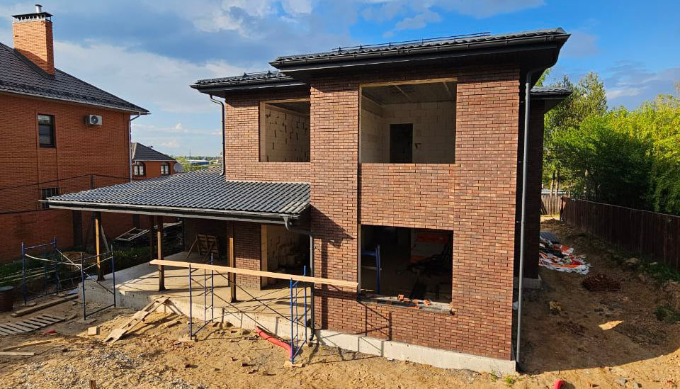 У них был участок и наброски по проекту. В то время они присматривались к разным компаниям и выбирали для себя лучший вариант. После консультации с нами, заказчики заключили договор на проектирование, сделали геологию и замер на участке и начали разработку архитектурной части проекта. Общая площадь 335 кв.м. Площадь помещений 241 кв.м. - кухня-гостиная с выходом на террасу - спальня - 2 санузла - гараж с бойлерной и кладовой - кладовая в подлестничном пространстве - мастер-спальня со своей гардеробной и санузлом - 2 спальни - гардеробная - общий санузел Один из нюансов строительства был участок с уклоном. Чтобы поставить дом на стандартный фундамент, нам пришлось в одной части участка срезать порядка 70 см грунта. ✔️ Кладку стен делали параллельно с облицовкой фасада. ✔️ Стены 1 и 2 этажа поставили за лето и осень. ✔️ Зимой сделали стропильную систему, весной положили кровельное покрытие, софиты в подкровельном пространстве и водосточную систему. Теперь шикарный большой дом радует зака