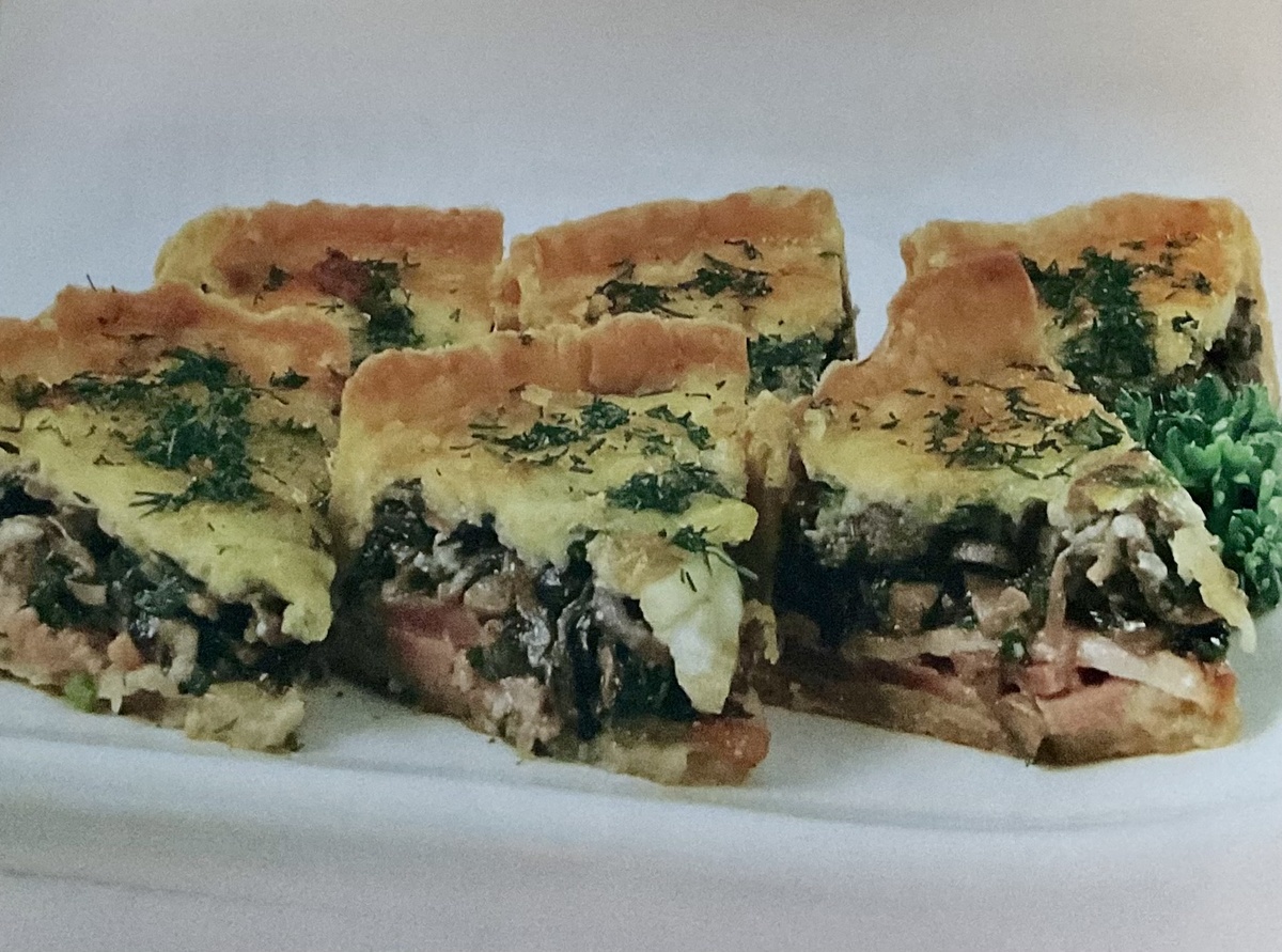 - На выпеченную основу слоем уложите смесь бекона, грибов и лука, залейте смесью яиц и молока.