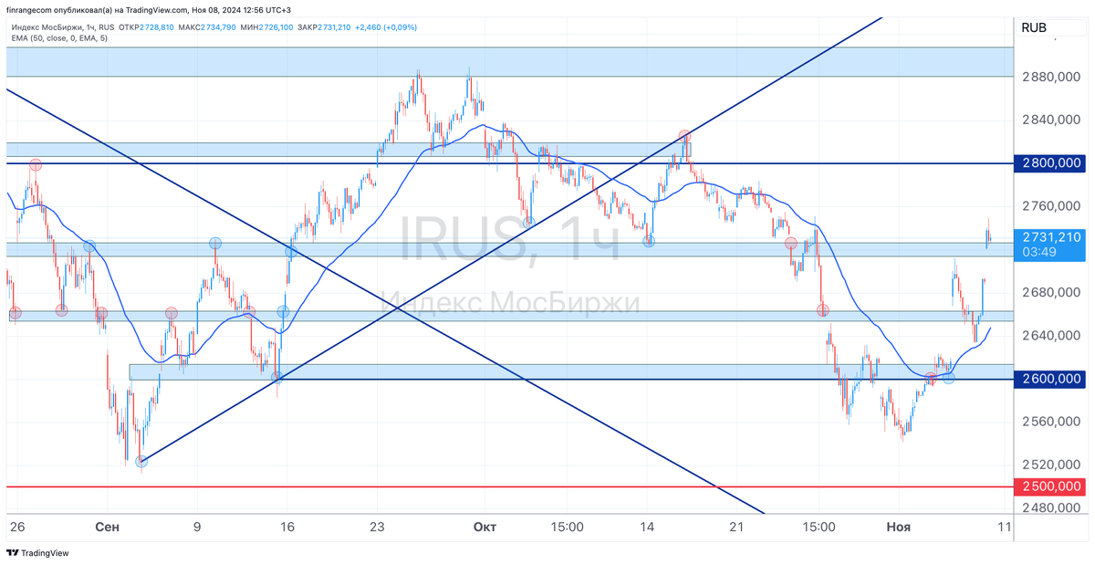 Данный обзор – это моё субъективное виденье рынка, на которое я ставлю свои деньги исходя из моего риск- и мани- менеджмента. На дневном графике нисходящий тренд, однако индекс МосБиржи формирует двойное дно. При этом, пока сохраняется возможность повышения ключевой ставки ЦБ в декабре. Поэтому, мы можем уйти в широкий боковик в диапазоне 2550-2900 пунктов. Двойное дно окончательно будет сформировано после пробоя 3000 пунктов. Смена медвежьего на бычий сантимент после победы Трампа в президентских выборах. Участники рынка ожидают переговоров между президентами РФ и США, и завершения СВО. Поэтому высокая ключевая ставка может игнорироваться рынком, пока Путин или Трамп не опровергнут обратное. СМИ только подогревают интерес со стороны покупателей. На Западе уже обсуждают снятие санкций в сфере финансов с РФ после победы Трампа. Сам же Трампа сказал: "Я еще не разговаривал с Путиным, но думаю, мы поговорим". Вчера после пробоя уровня поддержки по индексу МосБиржи на открытии рынка, акции