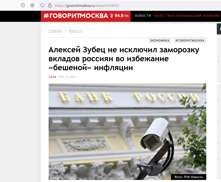 Это было зондирование или "бред"? Директор госинститута публично предрёк возможную заморозку вкладов россиян. Но его типа "неправильно поняли". На 1 августа 2024 года средства населения на счетах и депозитах в российских банках составили 50 триллионов (!) 390 миллиардов рублей. Это официальные данные Банка России. Сумма вкладов граждан составляет более четвери % прогнозной величины ВВП России на 2024 год (191,4 трлн рублей по оценкам Минэкономразвития). Только за первые полгода 2024 года банковские сбережения россиян выросли на 5 с лишним триллионов рублей. Такое взрывоопасное мнение в эфире радиостанции "Говорит Москва" высказал директор Института социально-экономических исследований Финансового университета при правительстве РФ Алексей Зубец. Он заявил, что что на заморозку вкладов правительство может решиться под угрозой "бешеной инфляции", если люди по каким-то причинам начнут массово тратить свои сбережения. Зубец сказал, что массовое снятие наличных может приключиться после того,