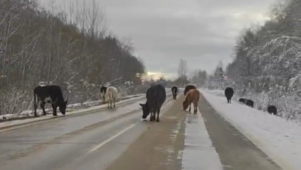 Жителей Тверской области встревожили коровы, которые бродят по заснеженной трассе