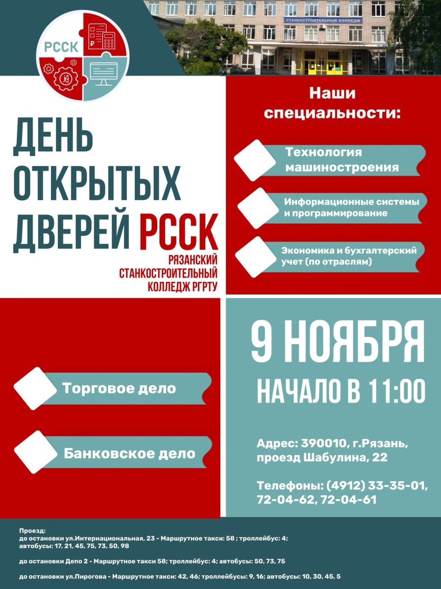 Рязанский станкостроительный колледж РГРТУ пригласил школьников и их родителей на День открытых дверей. Мероприятие состоится 9 ноября в 11:00. Отмечается, что участники смогут познакомиться с ведущими преподавателями, получить ответы на вопросы по всем специальностям колледжа, среди которых те, что выпускают самых востребованных на рынке труда специалистов — «Технология машиностроения» и «Информационные системы и программирование». Дополнительные вопросы можно задать по телефонам: +7 (4912)33-35-01, 72-04-62, 72-04-61. Возрастное ограничение 12+.